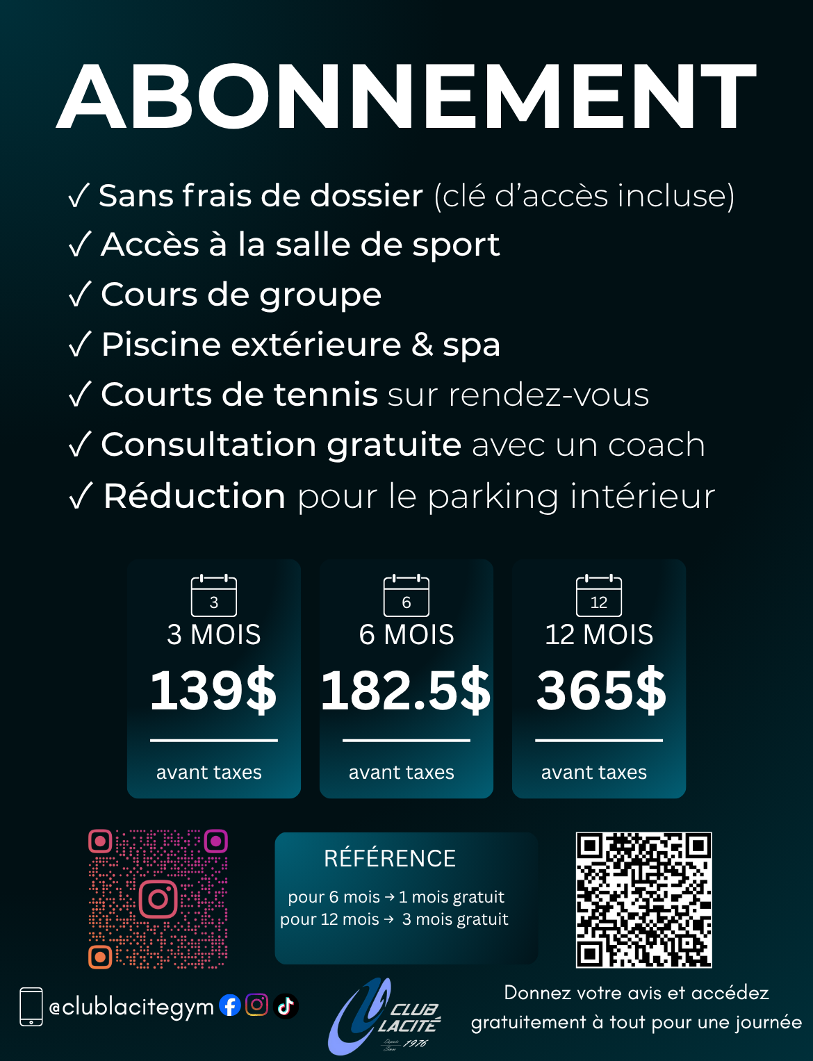 Une personne dans une salle de sport prépare à soulever une barre avec des poids. Texte en français indiquant que 1 an de référence équivaut à 2 mois, et ½ an à 1 mois, avec le logo du Club La Cité. Contact et site web du gymnase en bas.